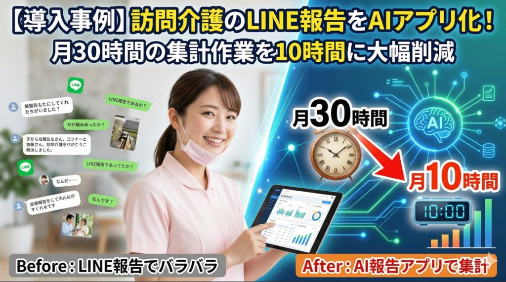 【導入事例】訪問介護のLINE報告をAIアプリ化!月30時間の集計作業を10時間に削減した方法